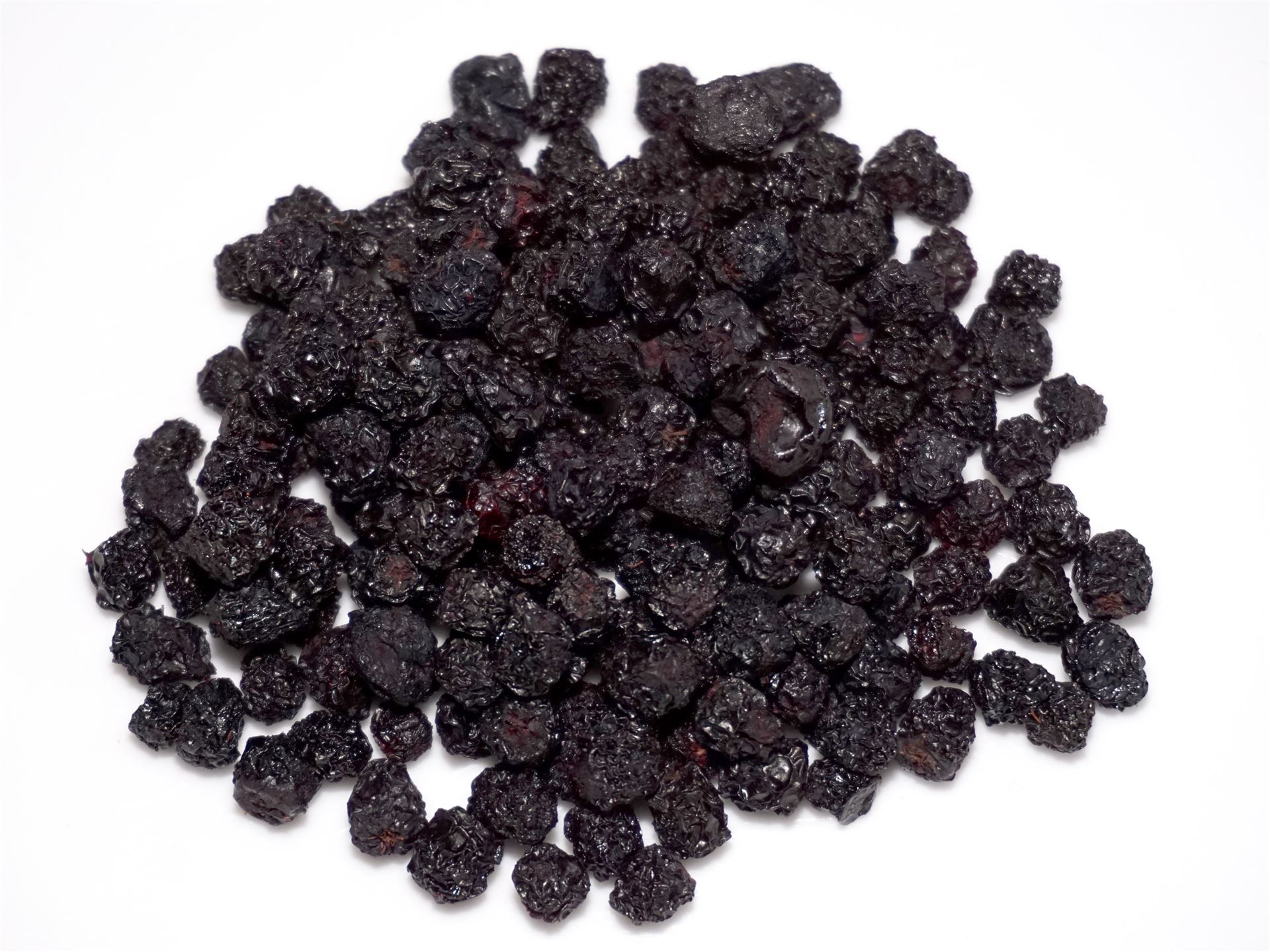 Dried aronia berries resemble raisins, taste deliciously like blueberries and are nice in muesli or as a snack between meals. The aronia berry, also called apple berry or black rowan berry, belong to the family of roses and are originally from Eastern North America. The fruit are pea-sized, black, often waxy, they taste sweet-tart-bitter. They are less suitable to be eaten raw but are mainly processed into juice or dried.
